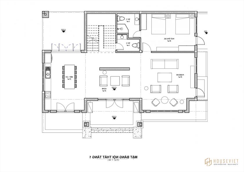 Fonctionnalité du premier étage de la conception Villa de jardin sur 2 étages avec toit en tuiles divisé en domaines fonctionnels distincts. Depuis le hall principal se trouve un grand hall central. Ici, le propriétaire accrochera des photos, des souvenirs de famille, précieux comme salle commémorative familiale. Sur le côté gauche se trouve un salon spacieux avec une grande capacité, afin que la famille de M. Dung puisse accueillir confortablement des invités dans la maison. À droite se trouve la salle à manger combinée avec la cuisine. C'est l'espace qui montre le confort, l'endroit où garder le feu pour la maison. A l'intérieur se trouve une chambre pour les grands-parents, assurant suffisamment de calme et de confort. Des escaliers sont situés dans le coin intérieur de la même maison pour monter à l'étage.