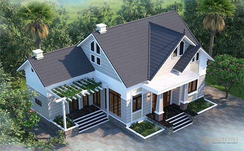 Mẫu nhà có mái dốc độc đáo, view trước nhà là sân vườn rộng rãi, thoáng mát. Thiết kế này sẽ ưu tiên cho khuôn viên cây cảnh đẹp giúp tăng tính thẩm mỹ cho tổng thể công trình.